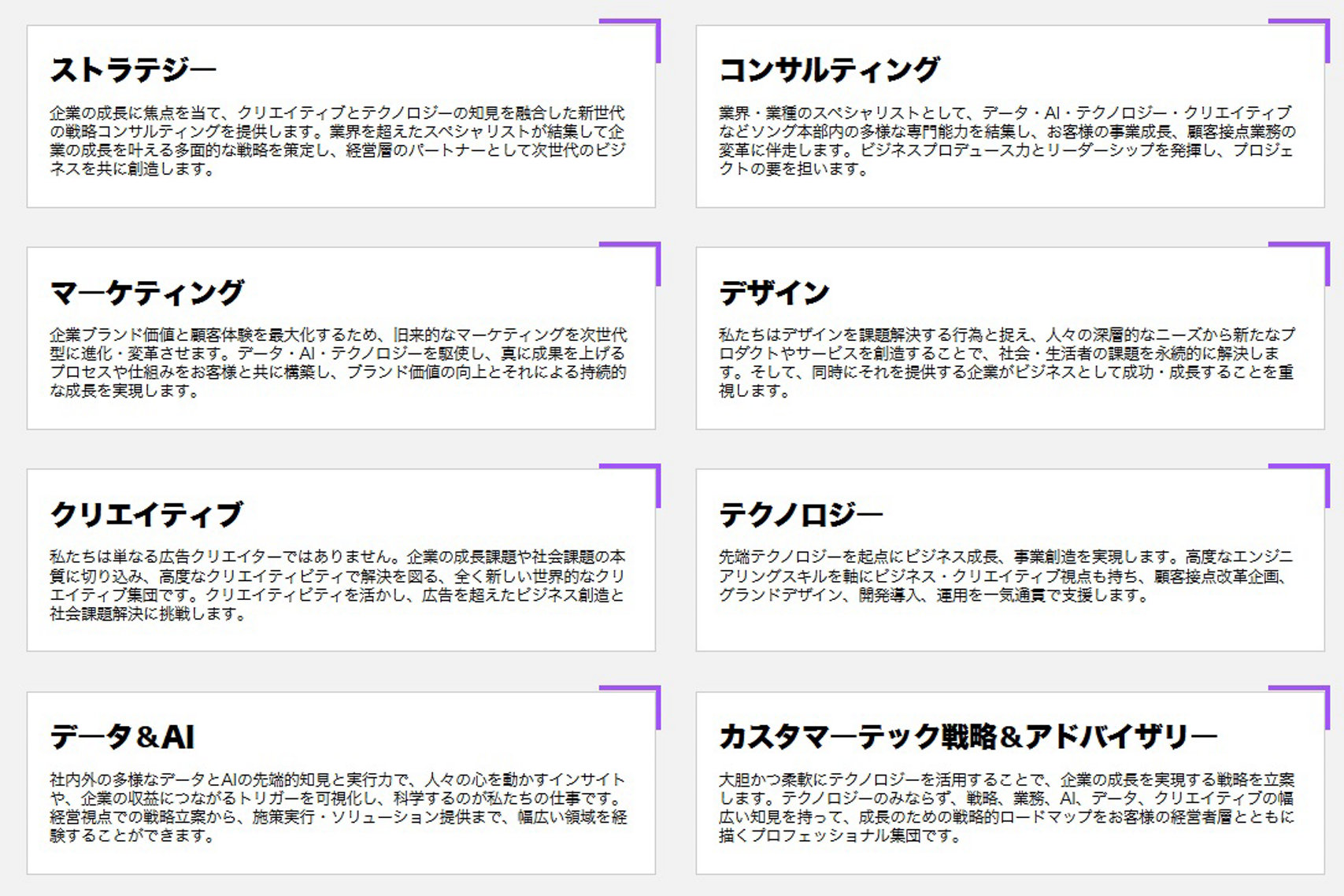 現在、ソング本部では大きく分けて以下8つの専門領域の専門家が活躍しています。1つのプロジェクトに対して複数のスペシャリストがコラボレーションすることによって、企業やブランドにとって、過去に例のない斬新で革新的な価値提供を生み出しています